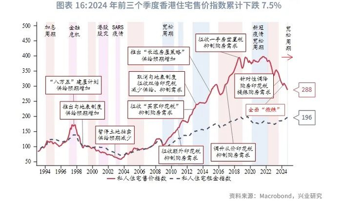 香港楼市在2024年前三个季度持续低迷。根据差饷物业估价署的估算,至2022年9月,香港整体住宅价格从2021年9月的高点下跌了约30%。多重因素造成了这种回调,包括中国内地经济复苏乏力、联系汇率导致香港借贷利率高企、庞大的楼市库存等。随着美联储9月开启降息周期,叠加内地新一轮的财政刺激政策出台,中原城市领先指数有所改善,目前已经从底部反弹2%。