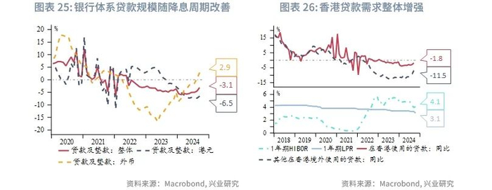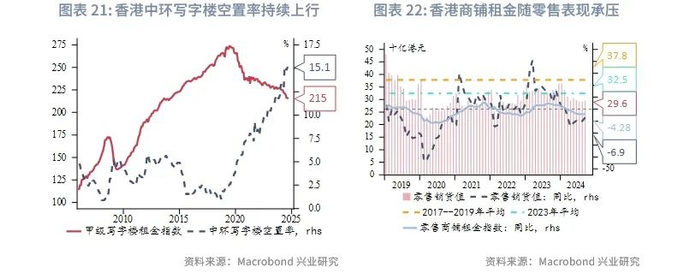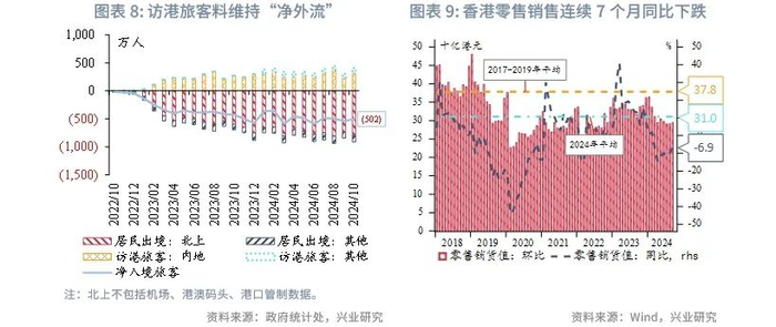 但结构性压力与外部风险仍将制约香港经济的复苏。内地访港旅客消费习惯的变化、香港本地居民的北上旅游、叠加互联网消费的逐步渗透,都给零售和旅游业带来结构性挑战。地产行业的大量库存也需要时间消化。此外,香港明年经济还面临诸多外部风险,例如美联储降息进程大幅放缓,特朗普短期内挑起比市场预期更大的贸易争端,或者国内经济复苏比预期慢等。