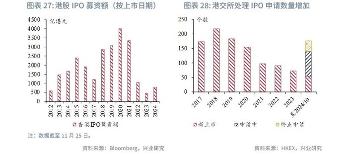 一级市场方面,今年以来香港IPO融资规模从2023年的461亿港元回升至目前的783亿港元,9月底以来股市的上涨提振了市场对企业估值上调的信心,若未来中国内地出台更多增量政策,推动内地基本面改善和市场信心回归,香港市场IPO融资规模或进一步上升。中国内地上市巨头公司或效仿美的寻求双重上市,同时特朗普的对华竞争政策也可能促进在美上市中资企业回流。货拉拉与蜜雪冰城作为中国独角兽企业已申请监管批准在香港上市,11月19日,证监会主席吴清在国际金融领袖投资峰会上表示,随着中国证监会深化资本市场双向开放,进一步保持境内外融资渠道的畅通、进一步提升境外上市的备案效率,未来企业或将更积极寻求赴港上市。