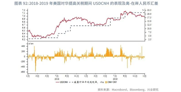 对比2018-2019年美国对华加征关税期间USDCNH的表现,当平均关税率从3.1%提升至21%,USDCNH上涨约7%,若未来美对华征收60%的关税,离岸人民币或受更大影响。此外,在加征关税期间,离岸-在岸人民币汇差往往扩大,平均扩大34pips,最高可达400-500pips。
