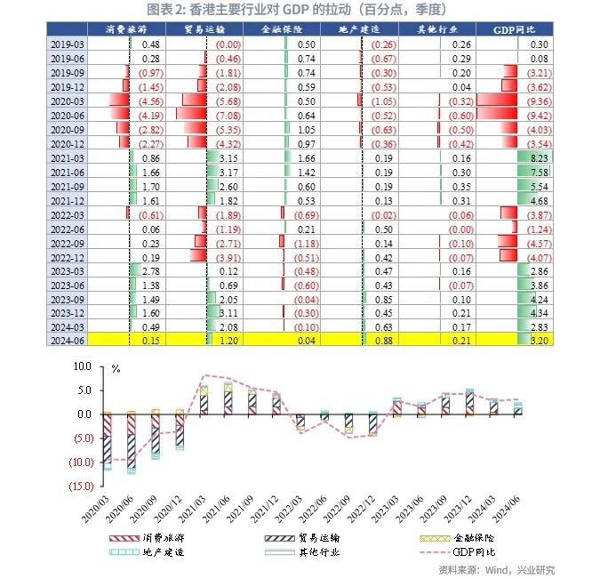 从行业来看,受益于外需增长,运输与仓储业增速较快,为拉动服务业的领跑行业。由于私人消费不振、旅游业仍待恢复,零售、住宿等行业缺乏增长动能。高息环境令香港金融业2024年持续承压。但随着美联储开启降息周期,香港高息环境逐步缓和,且随着9月底内地一揽子刺激政策的推出,香港金融业出现逐步企稳迹象。