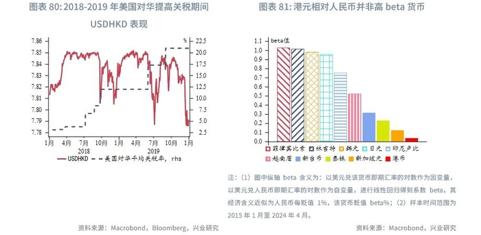 若未来美国针对中国增加更多关税,这势必会对人民币产生影响,进而对亚太货币产生外溢性影响。为此我们测度了人民币贬值1%时,亚太货币的贬值幅度,可以看到港元相对人民币并非高beta货币,或受联系汇率制度影响,说明人民币的贬值对港元的外溢性影响并不大。
