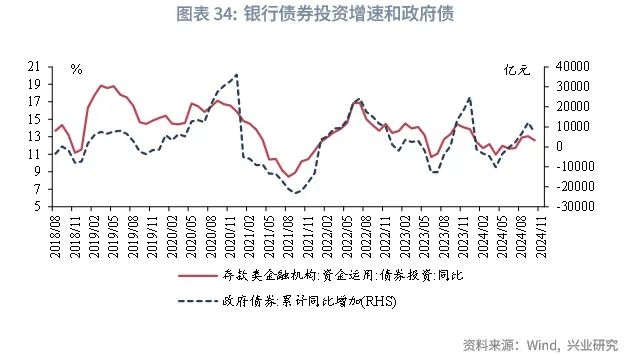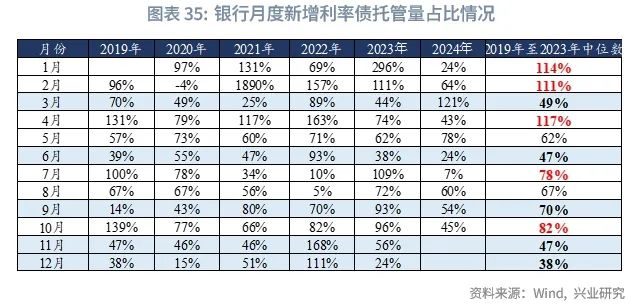 展望2025年,从银行角度来看,由于政府债供给放量是确定性事件,银行预计被动在一级市场承接政府债发行,从而使得银行债券投资增速被动上行,而银行主动增配债券的力度(以银行月度新增利率债占总利率债总托管量的比例衡量)增强主要在1-2月和季初月。