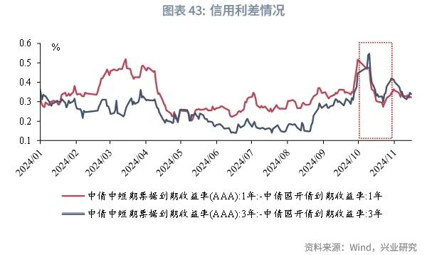 第2阶段为2024年9月24日之后,9月24日至9月末,金融支持经济高质量发展有关情况的新闻发布会、中央政治局会议召开,降息、降准、存量房贷利率调降均落地,政治局会议指出“要加大财政货币政策逆周期调节力度”、“要促进房地产市场止跌回稳”,财政政策的态度积极转向,央行也创新了证券、基金、保险公司互换便利和股票回购增持再贷款,支持资产市场发展,市场风险偏好提振,股市拉涨,股债跷跷板效应增强,债市利率上行。但在信用未宽,基本面修复的持续性仍待观察的背景下,债市利率反弹有限。