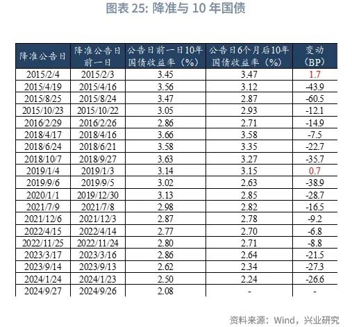 在节奏上,年内第一次降准公告后,10年国债收益率短线下行的概率较大,而年内第二次降准公告后,10年国债收益率短线上行的概率较大,可能的原因是年内降准的利多效应呈边际递减。我们观察到,在2019、2021、2022、2023年,降准的次数均为2次,在第一次降准公告后,10年国债在降准公告日后1个月的收益率较降准公告日前一日分别变动-3.8bp、-12.2bp、4.8bp、-1.2bp,在第二次降准公告后,10年国债在降准公告日后1个月的收益率较降准公告日前一日分别变动12.4bp、-5.0bp、3.0bp、5.5bp。从2024年的情况来看,10年国债在第一次降准公告日后1个月的收益率较降准公告日前一日下降10.3bp,在第二次降准公告日后1个月的收益率较降准公告日前一日上升7.5bp。