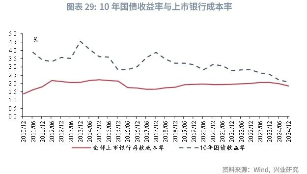 同时,OMO利率调降后,LPR和存款利率也将顺势下调,为了缓解银行净息差的压力,存款利率的调降幅度可能大于30bp。我们以报告《规范同业存款定价的影响有多大?》[4]中的方式测算大行和中小行的存款成本率,假设2025年3年期定期存款挂牌利率下行30bp、45bp、60bp,居民和企业活期存款占比为26.1%、25.6%、25.1%,并叠加上述报告中2024年规范同业存款定价对银行成本的影响,预计银行存款成本率落于1.78%-1.82%、1.89%-1.93%、1.87%-1.90%区间,需关注居民和企业活期存款占比下降的幅度对银行存款成本率的制约情况。在上述假设的条件下,从银行的视角来看,2025年10年国债收益率的潜在下行空间在1.8%-1.9%附近。
