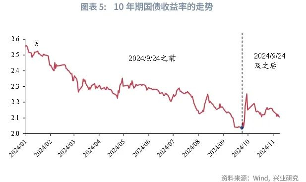 以政策态度的转变为分界线,2024年以来的债市主要可以分为2个阶段。第1阶段为年初至2024年9月23日,在此期间,宏观基本面偏弱,今年前三季度,GDP当季同比增速和社融同比增速均趋势性下行,同时,国内物价走势也偏弱,前三季度CPI、PPI累计同比分别为0.3%、-2%,宏观基本面利多债市;在上述宏观背景下,货币政策表现积极,降准降息均落地,而财政发力适度,上半年政府债发行节奏偏慢,同时,股市疲弱致市场风险偏好持续受到压制、机构资产荒严重,“钱多”的环境进一步驱动债市下行。2024年年初至2024年9月23日,10年国债收益率自2.56%下行至2.04%,在此期间,央行多次参与债市长端利率的风险管理,使得债市利率在下行趋势中遇阻,但不改运行方向。