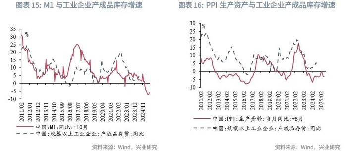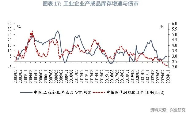 M1同比增速、PPI生产资料分项是工业企业产成品库存增速的领先指标,分别领先10个月、8个月左右,从上述指标来看,2025年工业企业的库存周期和工业企业产成品库存增速易下难上。从库存周期与债市的关系来看,债市的明显上升往往在一轮大的补库周期附近,弱补库或去库时,债市利率趋于下行。因此,2025年库存周期或也对债市偏利多。