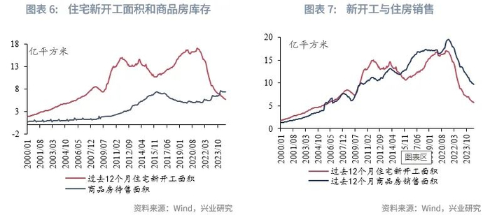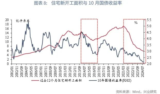 我们在《从海外经验看我国房地产何时触底》[1]的报告中观察美国经验提出“新房销量的触底回升或是新房开工回升的前置条件”,考虑我国城镇化率、人均住宅面积等因素,我国新房销售面积或于2026年前后触底。从我国的经验来看,我国住宅新开工面积底部滞后于新房销售面积底部约3-5个月,以此来看,2025年我国住宅新开工面积绝对水平或仍延续下行。同时,我国当前商品房待售面积约7.3亿平方米,接近历史最高水平,在商品房库存高企的背景下,政策基调更加注重化解存量,增量部分受到较为严格的控制,住宅新开工面积短期转向的难度较大。从住宅新开工面积和债市的关系来看,2025年房地产周期仍有下行压力,对债市整体偏利多。