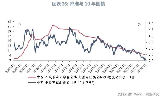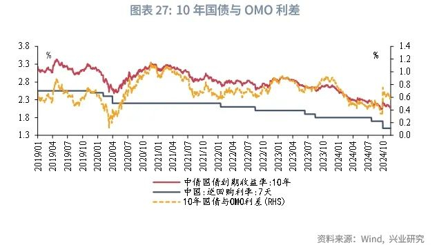 基于前文分析,2025年基本面或仍有压力,通胀水平偏弱,央行预计将延续支持性货币政策,降准降息可期,广谱利率和社融融资成本或将延续下行。根据兴业研究宏观市场部预测,2025年央行或将降准2次、下调OMO利率30bp。