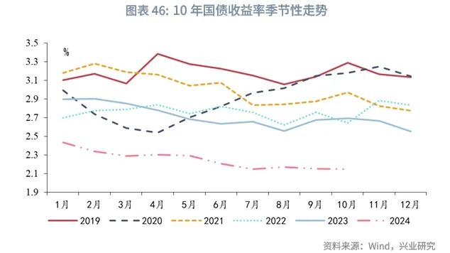 从债市的大方向来看,基于前文分析,2025年经济基本面或走向房地产周期、朱格拉周期、库存周期共振向下,通胀仍将处于较低水平,货币政策延续降息降准,宽松周期延续,银行、保险的负债端成本仍处于下行通道,化债周期仍需低利率环境配合,债牛大方向仍在。但需考虑到,非银对债市需求的不确定性较强,股市行情或对债基、保险的投债力度形成扰动,理财规模或延续增长但增速可能会有下降风险,上述因素使得债市下行过程中可能阶段性走弱。