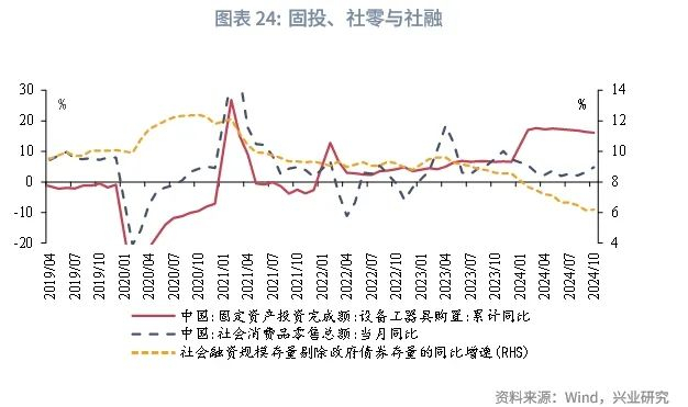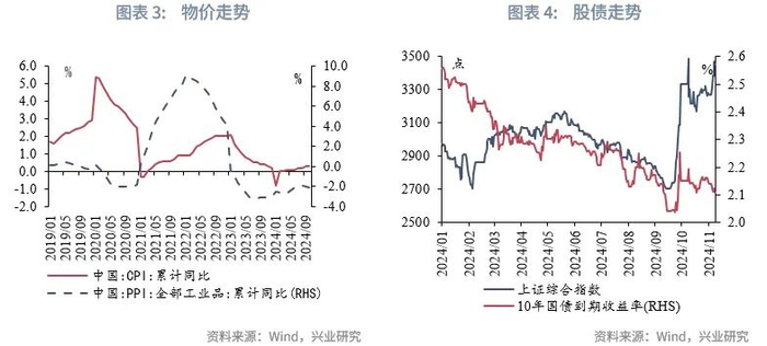 在提振经济方面,明年的财政发力点主要为提升中央杠杆率、扩大专项债发行规模和拓宽专项债投向领域、继续发行超长期特别国债以支持“两重”建设、加大力度支持大规模设备更新和扩大消费品以旧换新的品种和规模(“两新”)、加大中央对地方转移支付规模。提高赤字率可能会引发债市“赤字交易”,2008年以来提高赤字率当月平均会导致10年国债利率上升1.8bp(2013年以后为4.7bp),作为对比2017年、2024年和2018年、2021年、2022年在3月两会期间分别保持和降低赤字,当月10年国债利率平均下降4bp,其中,只有2022年3月10年国债月均利率上升,上升幅度2.9bp。目前市场预期2025年赤字率为3.5%-4.2%,相较2024年提升0.5%-1.2%,最大可能造成10年国债利率上行10-15bp。归结而言,整体的思路是提升国债、专项债、特别国债的发行规模来为各项领域提供资金以提振经济。支持“两重”、“两新”的政策在今年已经开始实施,但对经济内生需求的提振依然偏弱,明年上述有望进一步发力,在三周期下行的环境下,或对基本面形成一定托底。根据兴业研究宏观市场部预测,2025年全年社融增速较2024年小幅反弹,宽信用对债市的利空风险不大。