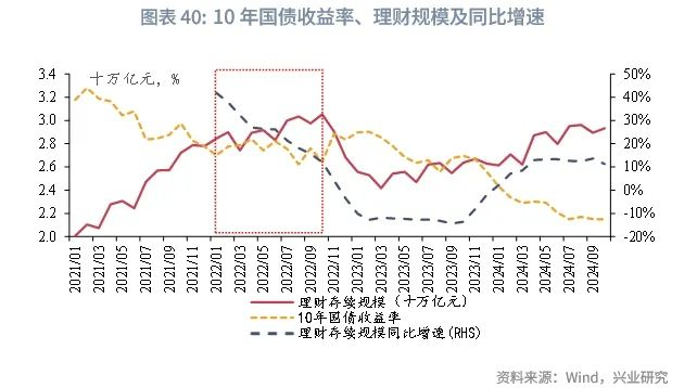 2025年,存款利率仍将下行,债市大方向仍处于牛市中,理财应对债市阶段性波折的能力增强,理财规模或仍有提升空间,利多债市需求,短债或将继续受益,1年信用利差与理财季节性买债规模保持较强的负相关性。但需注意的是,从理财规模增速来看,2024年4月以来,理财规模同比增速趋平。明年股市行情或好于今年,理财规模仍有增长,但规模增速或有放缓风险。参考2022年1月至10月,理财规模上行但规模增速下行的阶段,10年国债收益率大方向仍趋于下行,但下行幅度不大(自2.7%下行至2.64%),且期间波折较多,经历了约3段上行至下行完整的小波段。