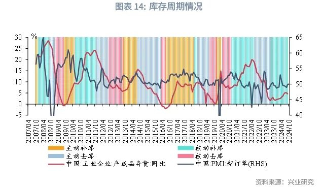 库存周期是3年左右的较短的经济波动的周期。我们通过工业企业产成品存货增速、PMI新订单来观察我国库存周期的情况,2024年工业企业产成品库存增速小幅回升,PMI新订单在枯荣线附近运行,低于枯荣线的次数偏多,全年整体处于弱补库阶段。