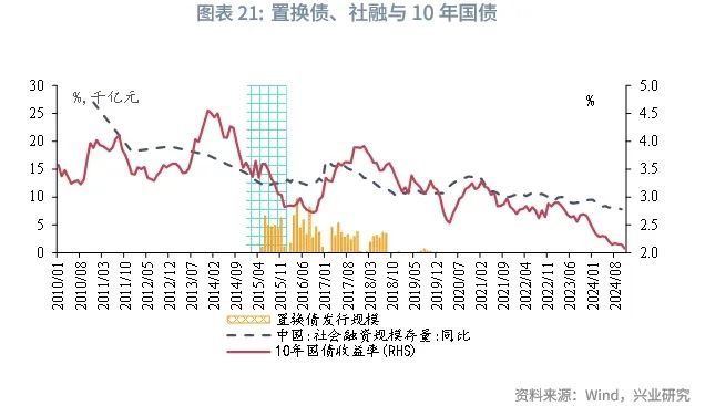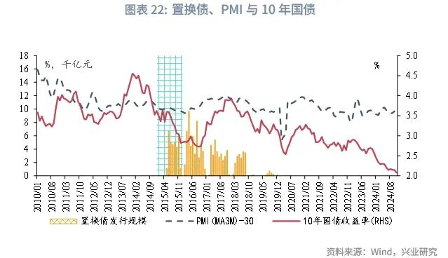 基于前文对基本面的分析,2015年是三周期叠加下行的年份,2025年与2015年所处的经济周期相似度或较高,且此轮化债规模与2015年的规模相近。观察2015年的经济与债市的情况,置换债在发行之前,债市交易供给担忧,10年国债收益率趋于震荡,在置换债常规发行之后,社融增速和PMI走势震荡下行,基本面带动10年国债收益率呈现下行趋势。此轮化债对企业和居民的内需的提振效果仍待观察,融资资源若向化债倾斜较多,民间融资资源可能被部分挤出,企业居民融资趋弱不利于利率上行。同时,在地方政府收支压力较大的背景下,化债的目标是将高息债务转化为低息债务,大规模政府债发行需要低利率环境配合,化债大环境对债市偏利多。此外,此轮化债可能导致部分涉隐债的城投债被置换,信用债融资可能收缩,信用债资产荒或将强化。