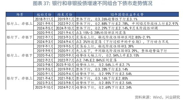 具体来看,我们将两者的债券投资增速分为“银行上、非银上”、“银行下、非银下”、“银行上、非银下”、“银行下、非银上”四种情形。在“银行上、非银上”、“银行下、非银上”的情形中,10年国债收益率走势普遍趋势性下行,典型时期为2019年11月至2019年1月、2021年4月至2021年8月等;在“银行下、非银下”的情形中,债市需求较弱,10年国债收益率趋于上行或顶部区间震荡或下行动力不足,典型时期为2020年9月至2021年4月、2022年7月至2023年3月、2024年3月至4月;在“银行上、非银下”的情形中,债市走弱概率较大,易触达债市的阶段性顶部区间,典型时期为2019年1月至5月、2020年4月至9月等。
