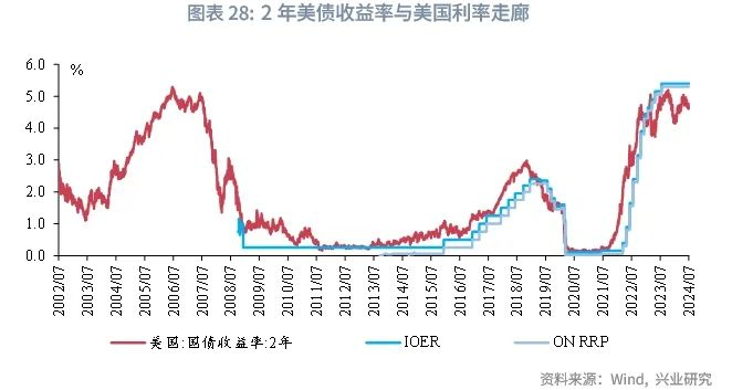 对于债市短端,7天逆回购利率降至1.2%,以临时隔夜正逆回购操作利率构建的利率走廊的区间相应为[1%,1.5%]。根据美国的经验,2008年之后,美联储的利率走廊以超额准备金利息率(IOER)和隔夜逆回购(ON RRP)利率构成,在降息周期中,2年美债利率可以运行至美国利率走廊的下限ON RRP以下。从当下我国的债市来看,目前我国债券市场处于货币政策宽松周期,债券市场通常会隐含降息预期,若参考美国市场经验,2年国债利率仍可能触达临时隔夜正回购工具的操作利率1%之下。