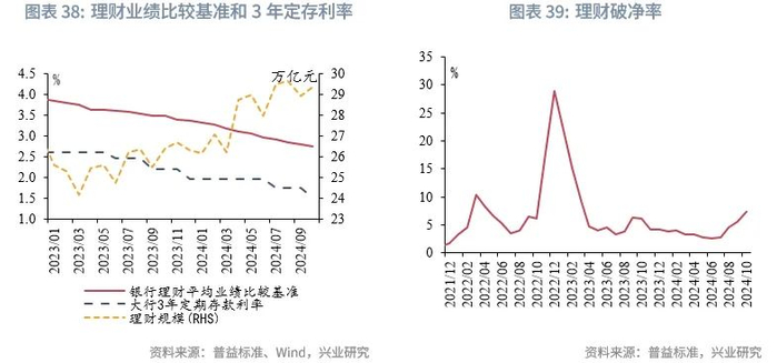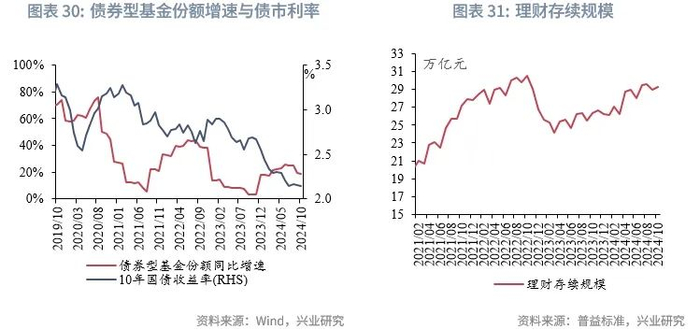 在理财方面,存款利率下行将驱动资金继续流入理财,但理财规模增速或难以上行,或使得债市利率波折增加,下行幅度减弱。具体来看,2023年以来理财的平均业绩比较基准均高于大行3年期定期存款挂牌利率1%以上,理财规模趋势性上升。同时,理财应对赎回更为成熟,在今年9月末至10月股市上涨、债市下跌的背景下,理财规模保持稳健,在二级市场上仍以较大力度加仓信用债。2024年9月、10月理财单位净值破净率分别为5.68%、7.29%,明显低于2022年11月至2023年1月的15%-30%,使得理财负债端稳定性也有所增强。