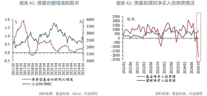 在债基方面,股市的演绎是债基规模增速的重要影响因素,同时债基“工具化”加深,可关注赎回带来的投资机会。具体来看,2016年以来,债基份额增速的趋势性下行往往伴随股市行情的好转,2025年股市行情或好于今年,关注股市对债基规模的影响。同时,今年以来债基“工具化”的特征越发明显,典型的时期为2024年10月,股市行情好转使得固收类产品遭遇一定赎回压力,债基作为理财的流动性管理工具首当其冲,10月大幅净卖出信用债2151亿元,是10月信用债行情走弱的重要原因,而理财应对赎回的灵活度更高,反而在10月进一步增配信用债,此时增配的点位性价比较好。因此,可以关注债基面临赎回压力时相关债券的投资机会。
