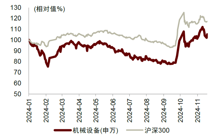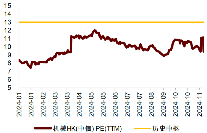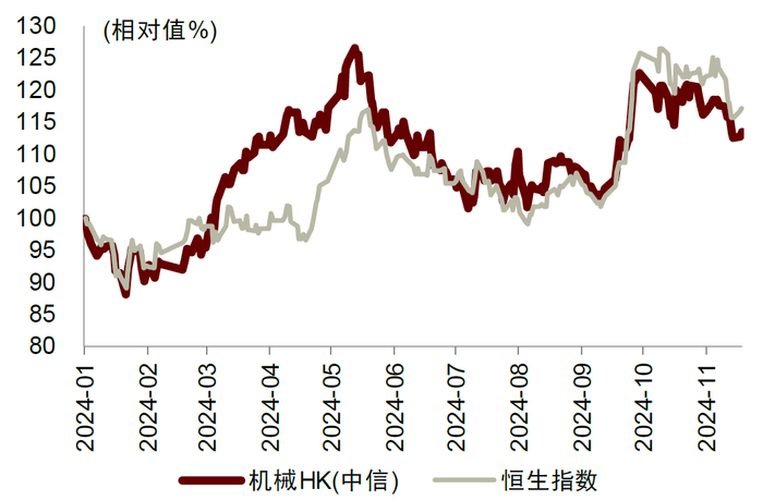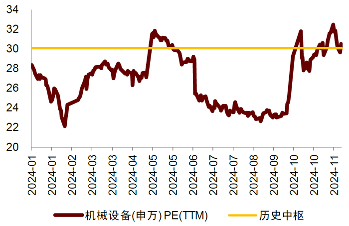2024年初至11月19日,A股机械设备(申万)市场行情收益情况跑输沪深300,H股机械HK(中信)市场行情情况亦略跑输恒生指数。机械板块A股P/E估值为30.5x,略低于历史中枢30.1x;机械板块H股P/E估值为11.2x,略低于历史中枢13.0x。