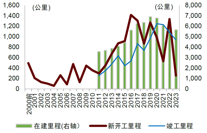 图表15:我国城市轨道在建/新开工/竣工里程情况