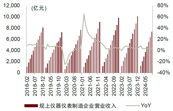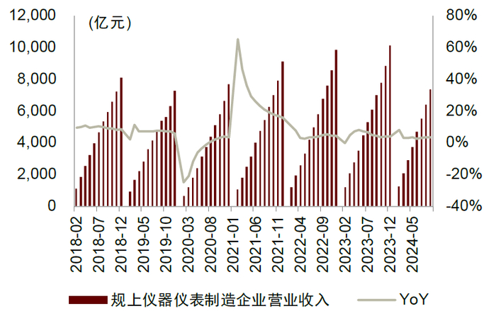 2024盈利基本维持,2025年关注存量更新。1)我国仪器仪表行业资本开支有所放缓,2024年1-9月,我国仪器仪表制造业固定资产投资完成额同比降低1.5%,同比增速延续下滑趋势;1-9月我国规上仪器仪表制造业实现营收7341.8亿元,同比+3.4%,实现利润总额714.4亿元,同比小幅下滑0.9%。2)9月20日,工业和信息化部发布《工业重点行业领域设备更新和技术改造指南》,仪器仪表多次出现在石油化工行业、钢铁行业、医疗装备行业,我们认为下游大型石油化工、冶金、电力等企业或有望迎来关键设备优化升级期,扩大工业自动控制系统装置行业的市场需求。