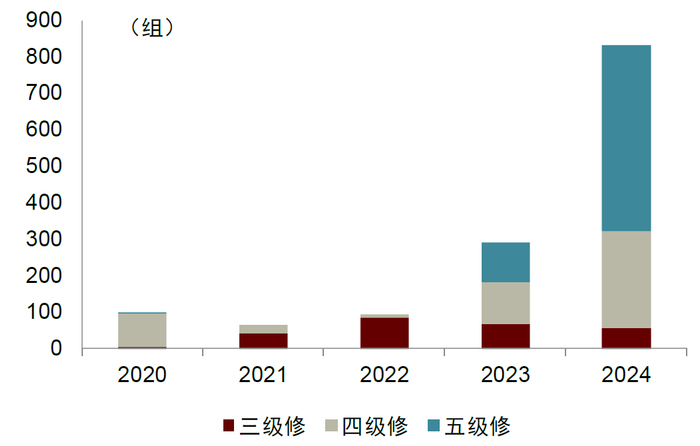 高铁路客运量带动动车组招标及维保需求景气上行。根据国家统计局,1-10M24我国铁路客运量为37.1亿人次,同比增长13.0%,其中10M24单月铁路客运量为3.7亿人次,同比增长6.0%,较2019年同比增长16.6%,整体继2023年铁路客运量回暖后持续增长,我们认为这提升了动车组使用率、进而提升动车组采购及维保需求。根据国铁集团,截至11月20日,今年已累计招标245组时速350公里动车组、高级修约833组(其中三级修约56组、四级修约268组、五级修约509组),明显高于前几年水平。我们预计2025年动车组需求仍将维持高位,订单交付量有望超过2024年,进而带动企业盈利上行。