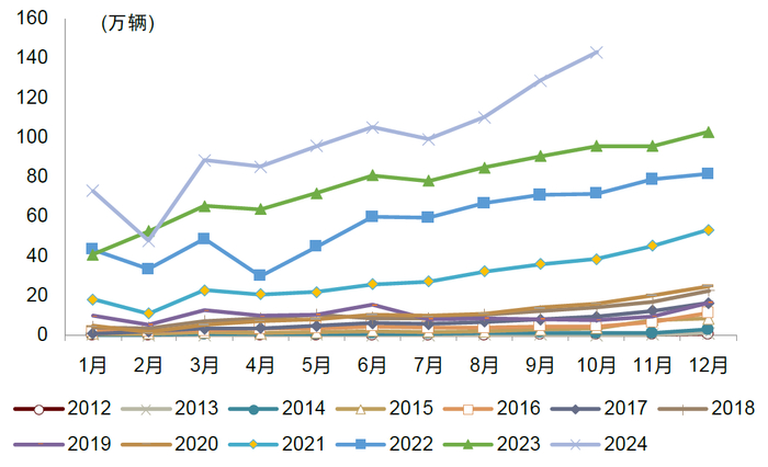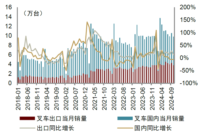 2024年以来叉车内需边际走弱。根据工程机械工业协会数据,2024年8月份开始我国国内叉车销量同比增速转负,三季度叉车内销累计实现18.3万台,同比下滑1.8%。国内叉车疲软主要由于制造业需求较弱,第三季度国内PMI连续处于50以下,我们估计受4、5类车(油车)销量下滑拖累,大车销量下滑幅度超过行业。
