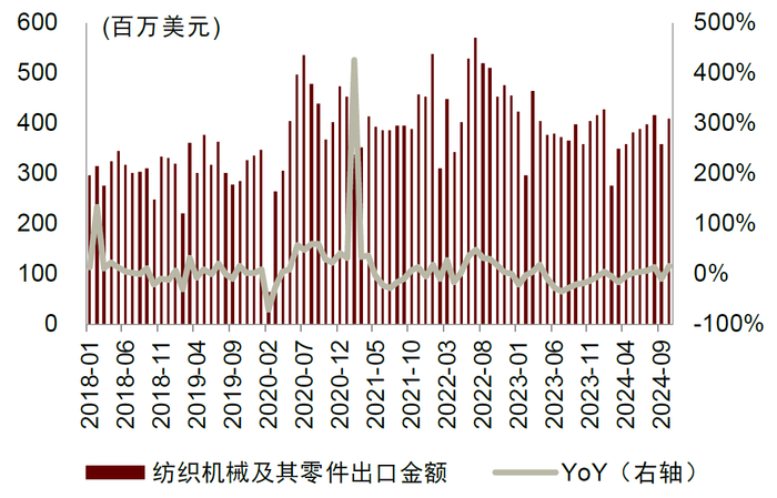 图表38:10月我国纺织机械及其零件出口金额同比+14.9%