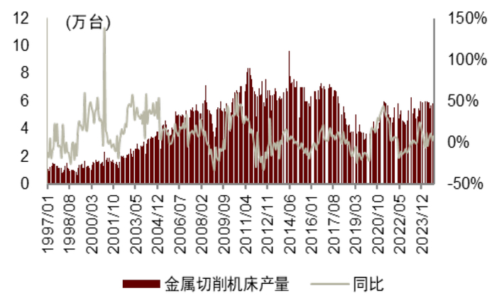 2024年机床行业多重困境,期待2025年反转。机床是通用设备的重要构成,从过往来看,通用设备制造业投资与机床产量基本同步。10月份我国金属切削机床产量当月同比增速7.1%,1-10月份产量累计增速相对平稳,尚未出现明显拐点。据中金策略组报告《哈里斯与特朗普的异同与影响——2024年美国大选追踪》,特朗普政府在选举期间声称大举加征关税,我们预期短期出口链条承压背景下内需政策或进一步加强以对冲经济向下压力。考虑到机床等以内需为主的细分行业自2021年以来经历不同时间维度的周期向下,至今仍处于国内需求磨底阶段,估值与股价位置相较历史中枢或其他可比板块均具有一定吸引力。