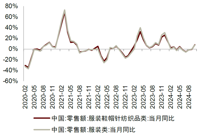 2025年海外补库有望持续贡献增量。1)2024年1-9月,我国规上纺织工业企业利润同比增长11.5%,增速有所放缓;受益于今年以来下游企业经营效益持续改善的传导,1-10月纺织制造固定资产投资完成额同比增长17.5%;下半年以来我国国内纺织工业企业利润同比增速有所放缓,内需整体呈现温和复苏状态。2)2024年9月美国服装批发/零售库存分别同比降低12.6%/1.2%,降幅延续环比收窄趋势,我们认为2025年海外品牌补库进程有望持续。