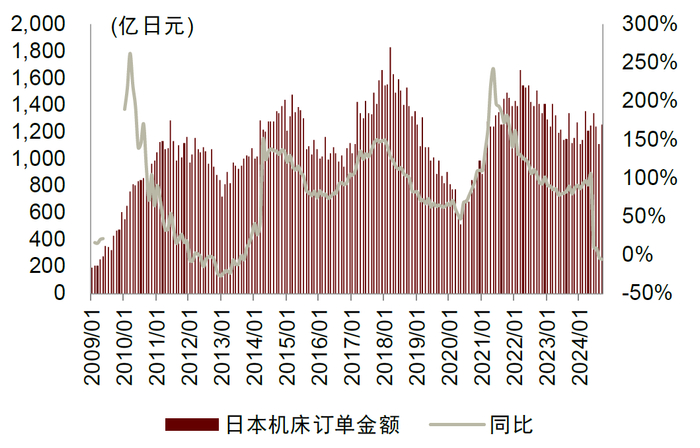 图表23:9月份日本机床月度订单金额为1253.0亿日元,同比下降6.4%
