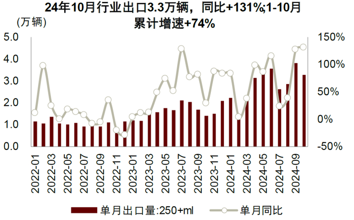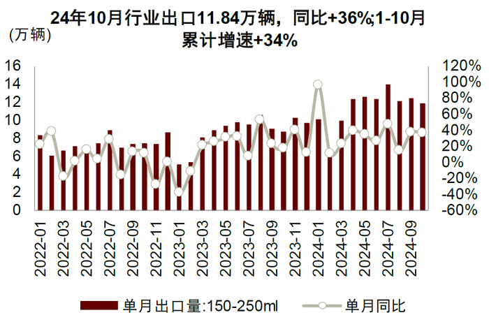 图表35:行业150-250ml摩托车单月出口及同比增速