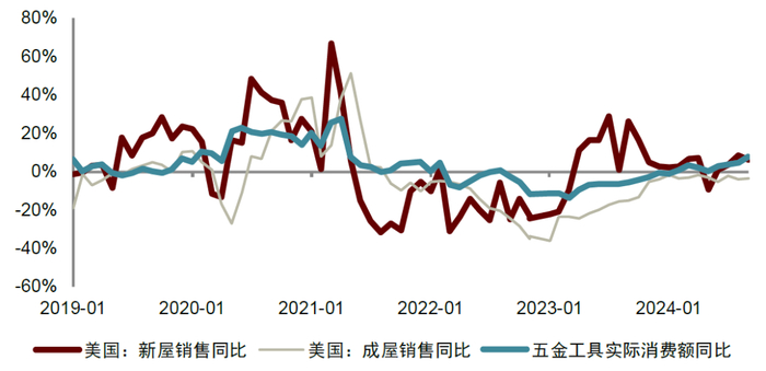2025年关注美国利率和地产走势,有望开启上行周期。中金宏观团队认为,中,美国处于历史性的宽财政时期,同时企业和居民仍处于金融周期上半场,因此一旦降息将推动美国地产销售量呈现上行期,进而拉动耐用消费品需求。从历史回溯来看,美国五金工具需求与美国地产呈现出较强的同周期性,通常降息将带动地产回暖和工具消费增长加快。
