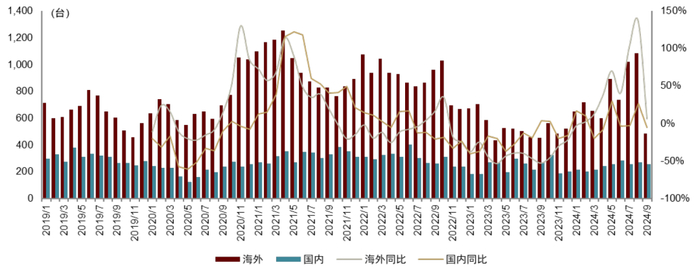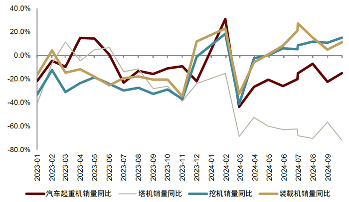 地产下行和中央财政发力背景下,2024年土方设备与其他工程机械表现较为分化。历史上工程机械周期与地产周期呈现出较高的同步性,2024年以来我国地产开工仍有双位数下滑,在此背景下,国内起重类设备和混凝土设备需求呈现出较大程度的下滑,对相关业务敞口较大的主机厂国内收入表现造成较大压力。土石方设备表现相对较好。其中挖机内部结构仍有较大分化,自3月以来,国内小挖实现同比较快增长,其主要受益于去年底中央特别国债发行以来,以水利、农田农村建设、城市更新等为代表的特别国债重点支持领域形成一定需求拉动,带动新机销售增长。而受制于地产下行和采矿业资本开支投入力度阶段性受阻,上半年中挖和大挖仍存在双位数下滑,自三季度起呈现出同比企稳态势。