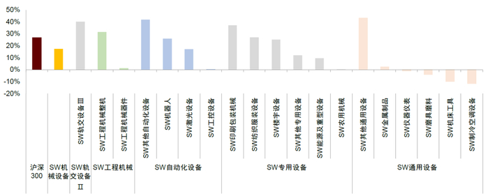 分板块看,2024年初至11月19日,机械板块中累计涨幅位居前五的为其他通用设备(+43.3%)、其他自动化设备(+41.9%)、轨交设备(+40.2%)、印刷包装设备(+37.3%)、工程机械整机(+31.5%),涨幅位居后五的为制冷空调设备(-11.6%)、机床工具(-10.1%)、磨具磨料(-4.1%)、仪器仪表(-1.1%)、农用机械(+0.2%)。