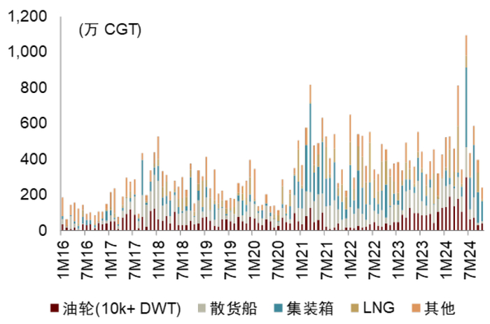 新船价格高位,高附加值船型签单增长。价上看,10月全球新船价格指数达189.6,同比+7.7%;集装箱船和油轮今年涨价较多。量上看,1-10月新船订单(以CGT计)同比+32%,集装箱船/油轮/LNG船/散货船分别同比+100%/+49%/+36%/-18%,集装箱船新签订单超年初预期,高附加值船型贡献订单增长较为显著。整体来看,1-10月新船订单金额同比+52.7%,10月末钢材价格指数同比-8.31%,钢船价剪刀叉较上年持续拉大。