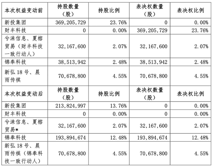 11月1日,新希望投资集团与锦奉科技签署《股份转让协议》,新希望投资集团向锦奉科技转让其持有的兴源环境1.55亿股股份,具体金额不超过3.59亿元。同日,锦奉科技与新弘18号、晨雨传祺贰号签订了《一致行动协议》。至此,锦奉科技及其一致行动人合计持有兴源环境2.65亿股股份,占总股本的17.03%。