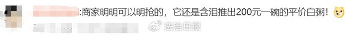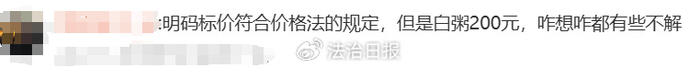 马丽红:一份白粥卖200元,虽然明码标价了但并不意味着一定没问题。明码标价这是法律最起码的要求,但如果价格过高可能构成不正当价格行为,需要具体情况具体分析。
