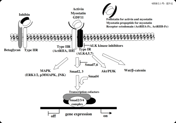 如图所示,在该通路中,ActRII被Activin,Myostatin(又称GDF-8,肌肉生长抑制素)激或者GDF-11激活,产生骨骼肌生长的负调控作用,从而抑制肌肉的生长,因此,只要能阻断它们的结合或者减少配体的数量,就能达到减少对肌肉生长的抑制,从而促进肌肉生长的效果。