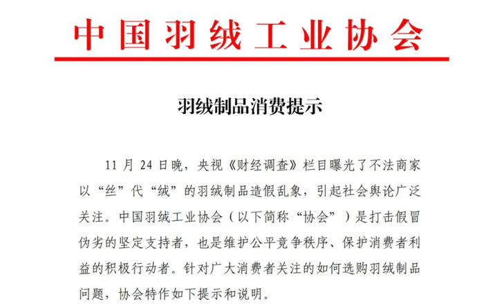11月27日,中国羽绒工业协会就近期羽绒制品造假乱象发声并发布《羽绒制品消费提示》。