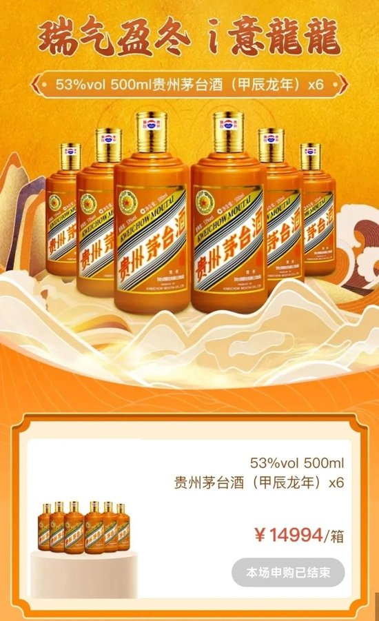 2024年11月20日起,“i茅台”推出“瑞气盈冬 i意龍龍”线上活动。所有i茅台APP实名认证用户都可以在每日09:00-10:00预约申购整箱53%vol500ml贵州茅台酒(甲辰龙年),官方售价每箱14994元。