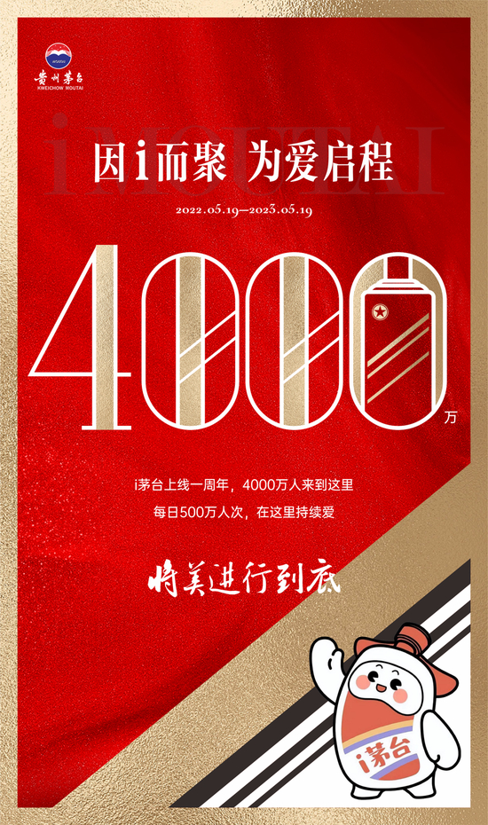 数据显示:2023年5月19日,“i茅台”正式上线一周年之际,注册用户达到4000万,平均日活突破500万,参与申购累计超2400万,预约次数达31.62亿,云购点击总人数超1700万,访问次数达13.92亿,参与交互活动达2600万。