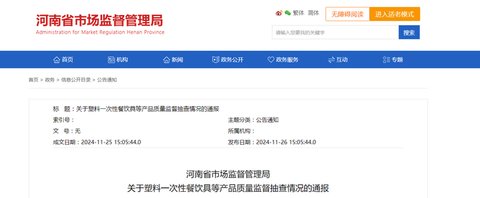 河南省市场监督管理局发布塑料一次性餐饮具等产品质量监督抽查情况通报