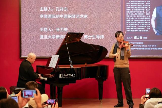 11月26日晚,天气渐寒,复旦大学新闻学院蔡冠深报告厅内灯火通明,笑语连连。钢琴家孔祥东带来《一位钢琴家的媒体记忆》专题讲座。他与复旦大学新闻学院教授张力奋展开对谈,“谈琴说媒”,分享钢琴演奏50多年的心路历程,讲述音乐与新闻之间的奇妙联系,还为师生现场弹奏了钢琴曲。