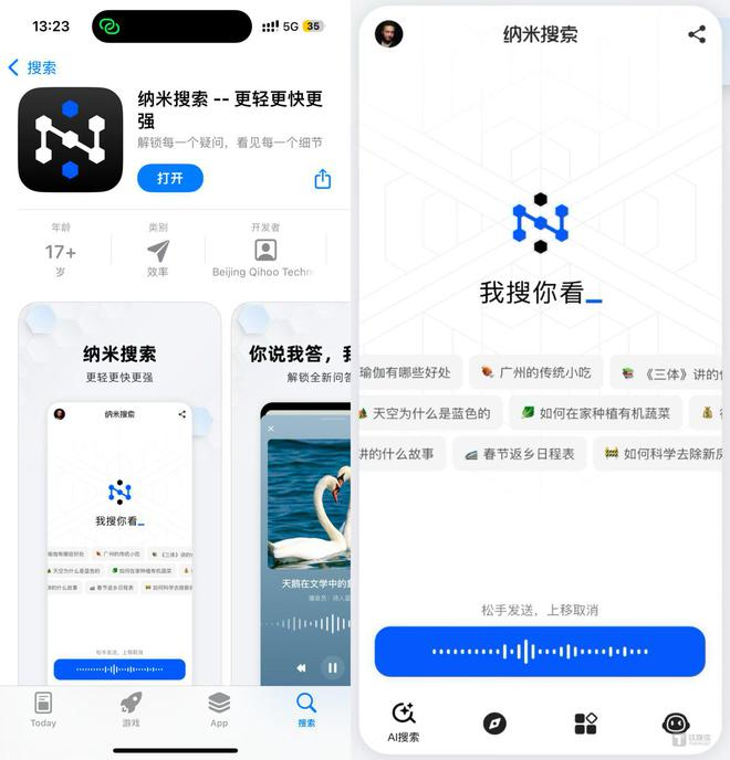11月27日消息,钛媒体App独家获悉,360集团(SHA: 601360)研发的全新生成式 AI 搜索产品“纳米搜索” App日前已上架到苹果App Store和应用宝等安卓应用商店,直接对标百度、阿里夸克、秘塔AI、Perplexity AI等多个 AI 搜索类产品。