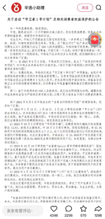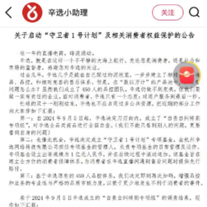 针对此番带货风波及虚假宣传争议,11月25日晚,辛选集团旗下官方账号“辛选小助理”发布题为《关于启动“守卫者1号计划”及相关消费者权益保护的公告》(下称《公告》),其中针对带货的“合普诺调制乳粉”做出声明称:经检测产品无质量问题,但主播在讲解产品过程中存在措辞不当,决定对当天销售的产品做退款处理,已发货和被动退款的用户,如有疑虑,可支持申请退一赔三。