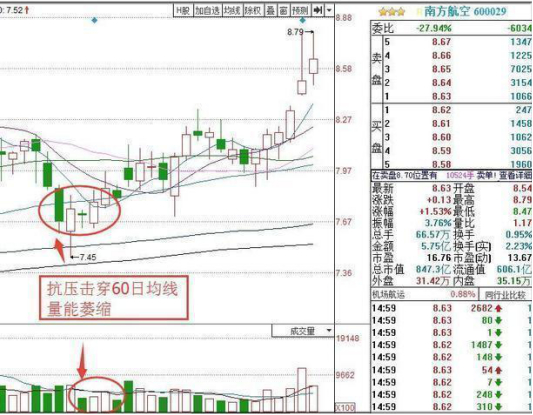 该股在回调至60日线附近之后猛烈打击,快速击穿60日线,但是在打压的过程中量能却是大幅萎缩的,随后快速收回60日线,明显的挖坑走势,挖坑结束后股价连续上涨。