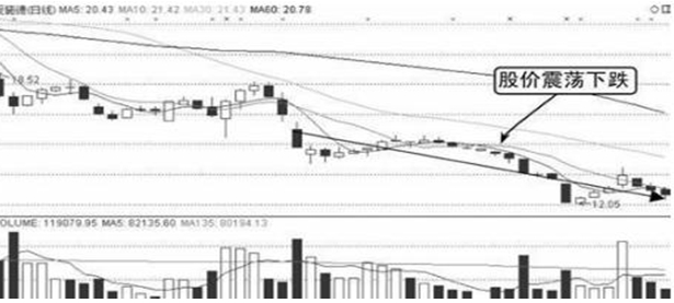由图中可知,该股在经过跳空下跌后股价继续下滑,成交量间断放大,股价收出多根小阴星和小阴线。若投资者遇此情况应及时在股价跌势放缓时出局。