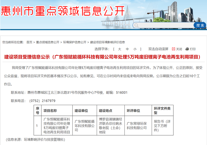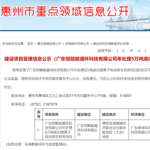 近日,惠州市生态环境局对广东恒赋能循环科技有限公司年处理5万吨废旧锂离子电池再生利用项目进行了建设项目受理信息公示。